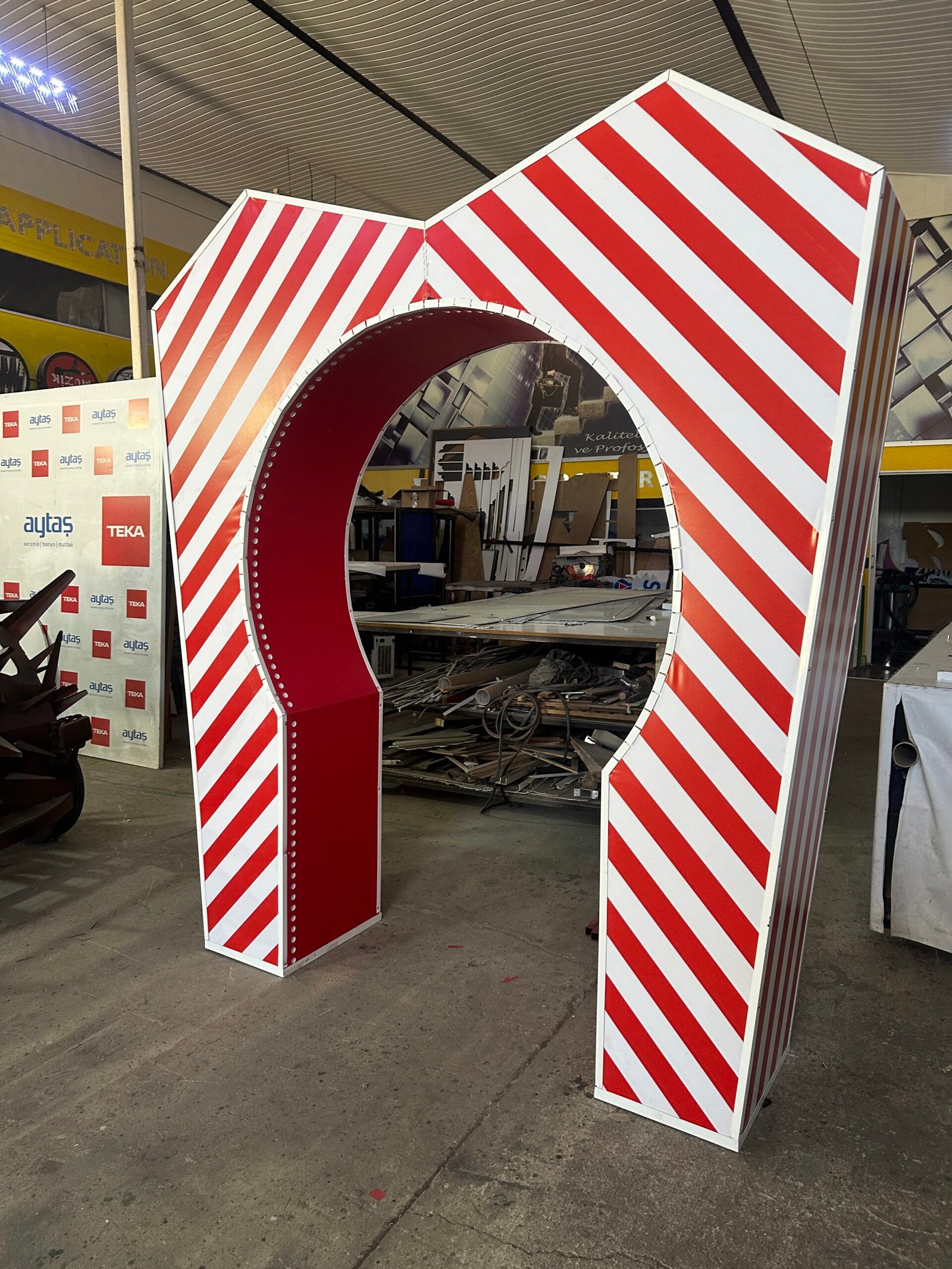 Kırmızı-beyaz diyagonal şeritleri ve geometrik formuyla dikkat çeken bu yapı, mekan girişlerinde veya sahne arkasında etkileyici bir çerçeve oluşturur. Antalya özel üretim atölyemizde hazırlanan bu dekor, içine yerleştirilecek aydınlatmalarla daha da vurgulanabilir.