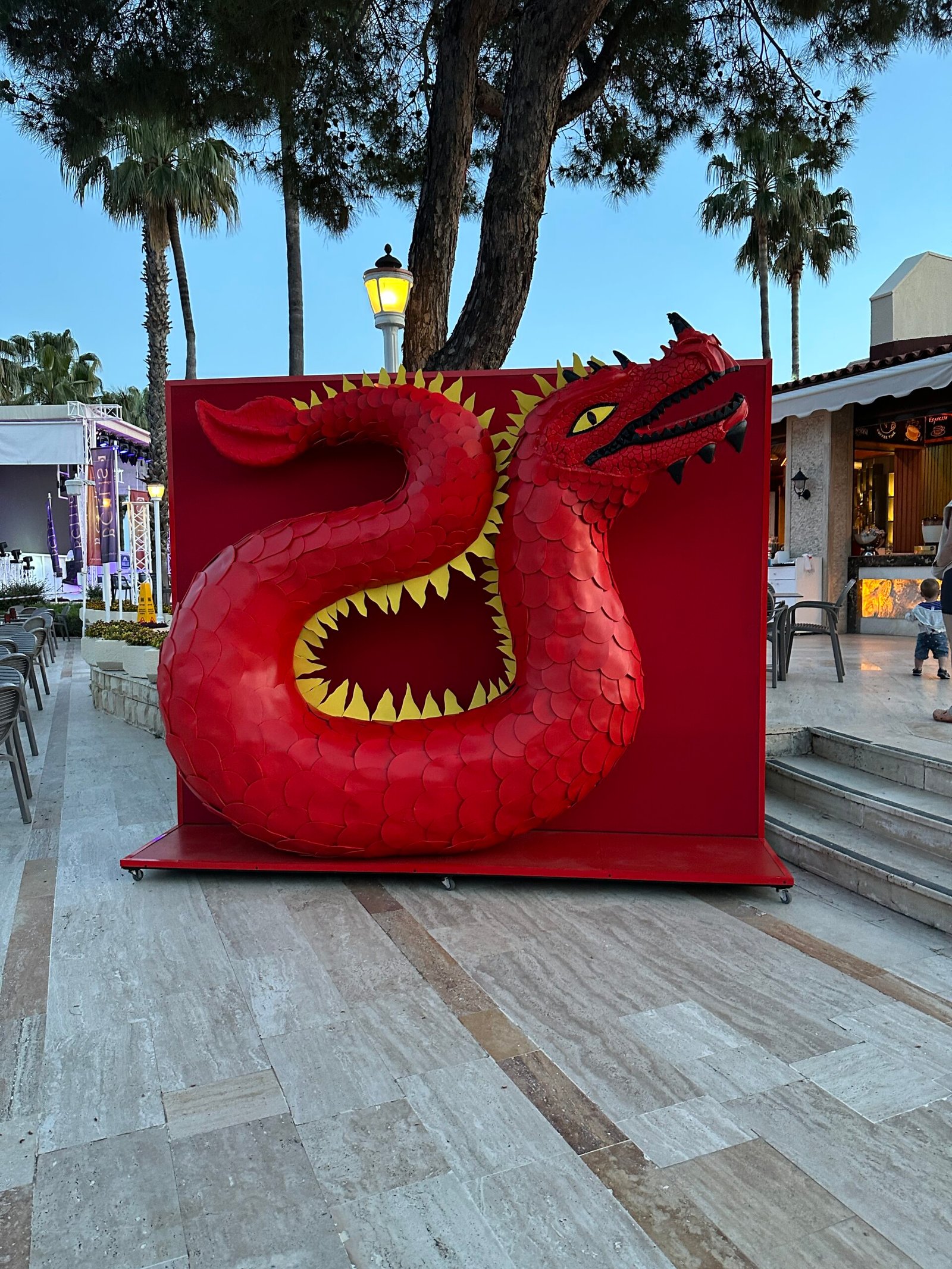 Uzak Doğu mitolojisinden esinlenerek tasarlanan bu figür; canlı kırmızı rengi, detaylı pul işçiliği ve sarı sırt detaylarıyla mekanın tartışmasız odak noktası olur. Otel bahçeleri, festival girişleri veya konsept partiler için üretilen bu heykel, davetlilerin önünde fotoğraf çekilmek için sıraya gireceği eşsiz bir sanat eseridir.