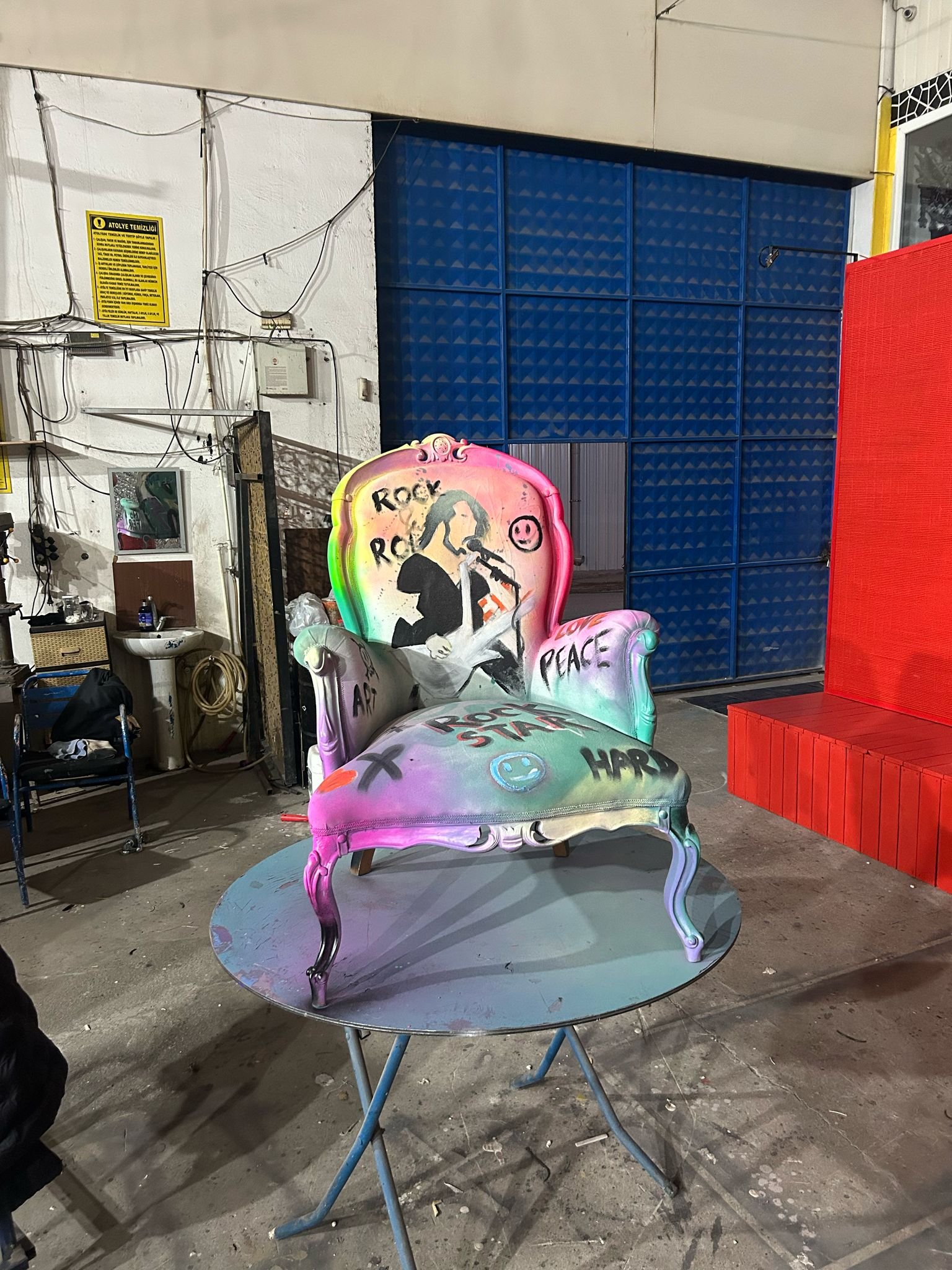 “Rockstar” serisinin bu tekli parçası; neon pembe, yeşil ve mavi renk geçişleri, üzerindeki “Peace & Love” grafitileri ve ikonik rock yıldızı silüetiyle mekanın en dikkat çekici köşesi olmaya aday. Otel lobileri, sanatçı kulisleri, dövme stüdyoları veya yaratıcı ofisler için sıra dışı bir oturma ve fotoğraf alanı sunar.