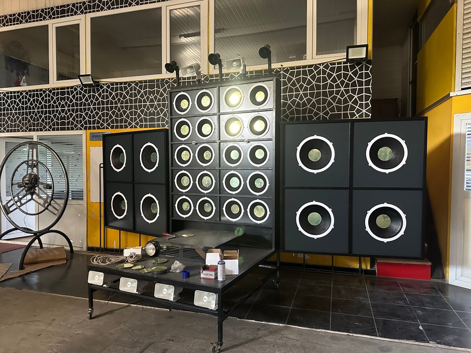 Gerçek konser hoparlörü (speaker) görünümünde tasarlanan, çoklu subwoofer ve tweeter detaylarından oluşan bu devasa yapı; müzik festivalleri, açık hava konserleri ve büyük DJ performansları için özel olarak imal edilmiştir. Sahne arkasını dolduran ve mekana endüstriyel, güçlü bir konser havası katan bu dekor; görsel bir güç gösterisi sunar. Antalya atölyemizde, sahne ölçülerinize göre modüler ve istenilen ebatlarda üretilebilir.